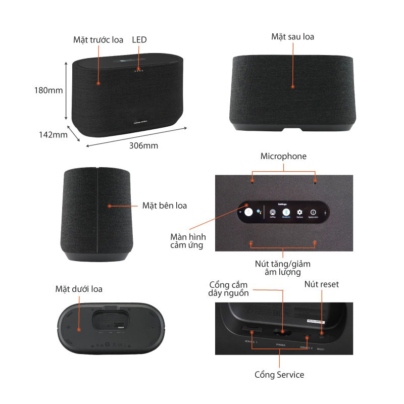 Mặt trước tích hợp đèn báo của micro và tên thương hiệu một cách khéo léo để nâng cao tính thẩm mỹ. Mặt trên tích hợp nút điều khiển tăng/ giảm âm lượng và màn hình LCD độ phân giải cao để giúp người dùng kiểm soát loa dễ dàng.