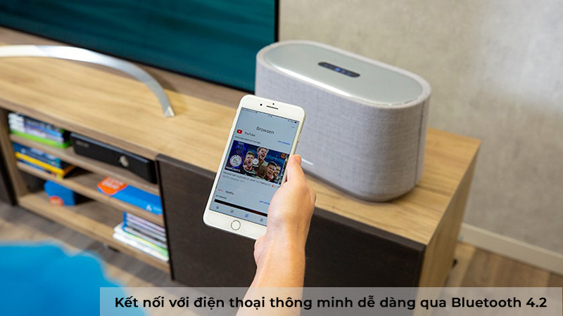 Harman Kardon Citation 300 cho phép bạn kết nối với điện thoại thông minh hoặc máy tính bảng để truyền phát nhạc qua Bluetooth 4.2 được tích hợp. Tuy rằng công nghệ này đã khá cũ so với hiện tại( 5.3) nhưng chất lượng đường truyền vẫn luôn đảm bảo sự ổn định và mượt mà, chất lượng âm nhạc cũng khá tốt, độ trễ thấp cho trải nghiệm nghe nhạc, xem phim trọn vẹn.