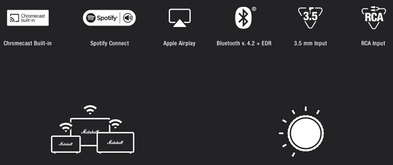 Dễ dàng kết nối âm thanh cho nhiều phòng phát cùng bài nhạc với Marshall Multi-Room app. Stanmore còn có thể tiếp nhận các nguồn âm khác qua cổng RCA và cổng 3,5mm. Bluetooth không dây và cặp cổng RCA, Chromecast, Spotify, Apple AirPlay.